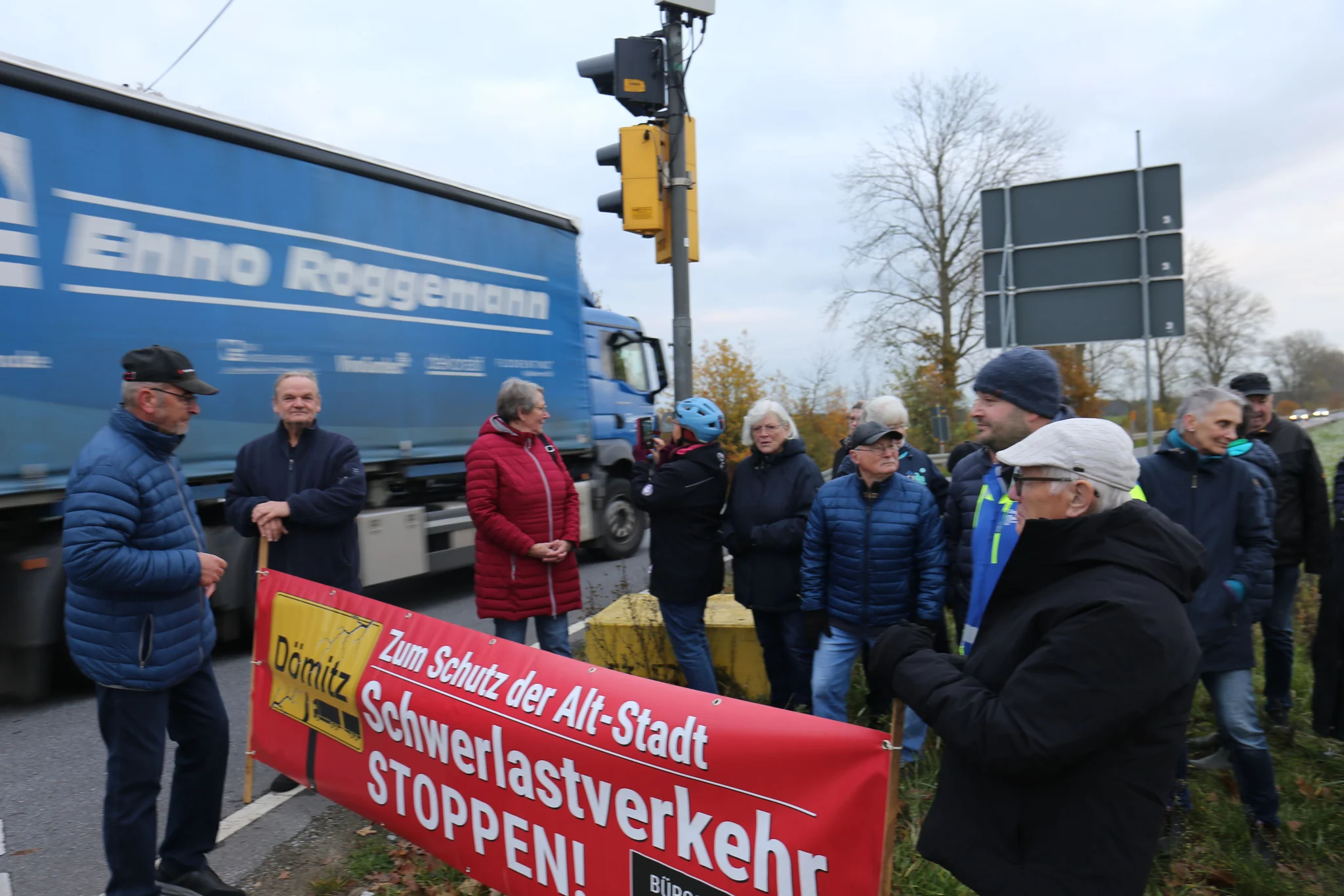 Der Pressetermin mit dem Nordkurier fand unter reger Beteiligung interessierter Bürger statt. Die Bürgerinitiative bekräftigte ihre Forderung nach einer festen Ampelanlage, um die Entlastungsstrecke für Schwerlast und landwirtschaftlichen Verkehr attraktiver zu machen.
